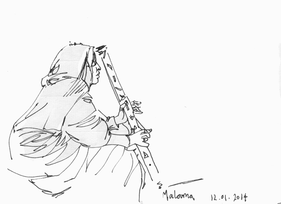 I went sketching twice at the Fondation Malouma. Yesterday they were recording the different modes. There was Lalla mint Teikmich, drum and voice, Malouma ardin (harp-like stringed instrument) and voice and Malouma's brother Lemrabott playing the tidinit (a small hourglass-shaped, four-stringed lute)